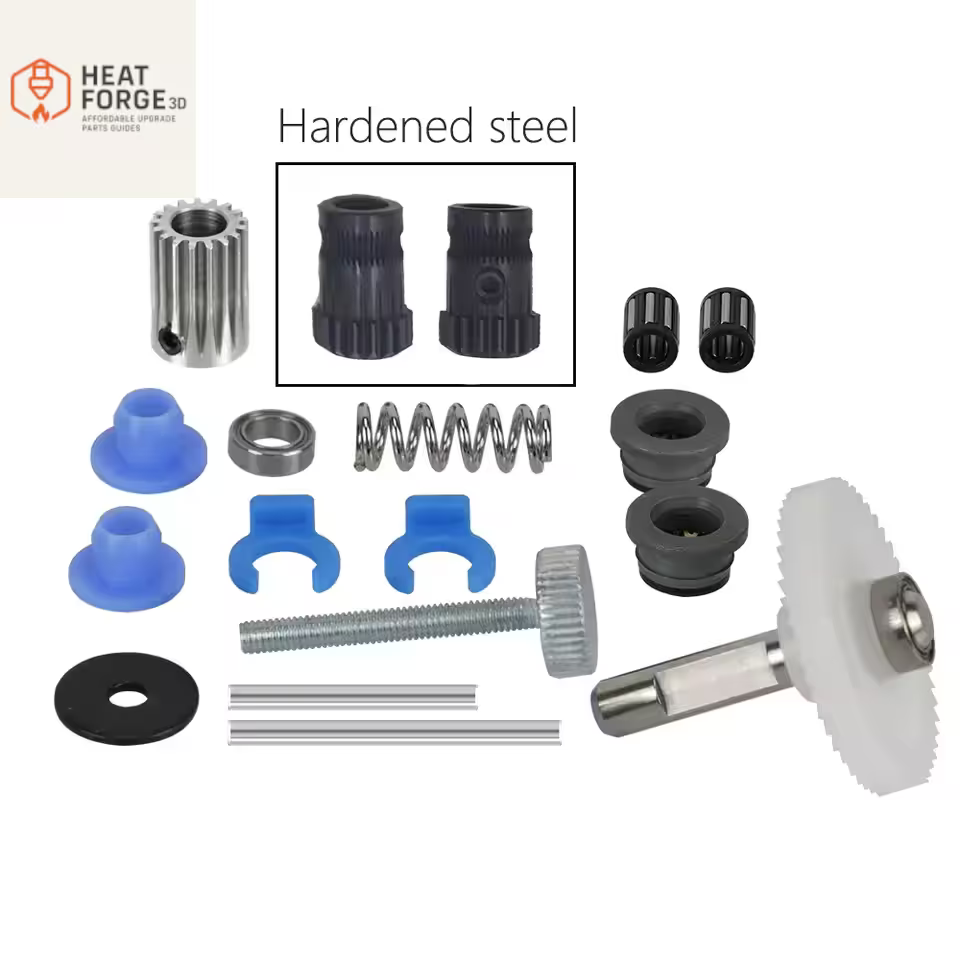 Karkaistut dual drive -hammasrattaat käsittelevät helposti kuluttavia ja joustavia filamentteja – täydellinen ratkaisu hiilikuitu-, pimeässä hohtaville ja muille kulutusta vaativille materiaaleille. Tarvitsetpa kokonaiskorvausta tai pelkkää ratassarjaa, tämä kit on suunniteltu kestämään pitkään.